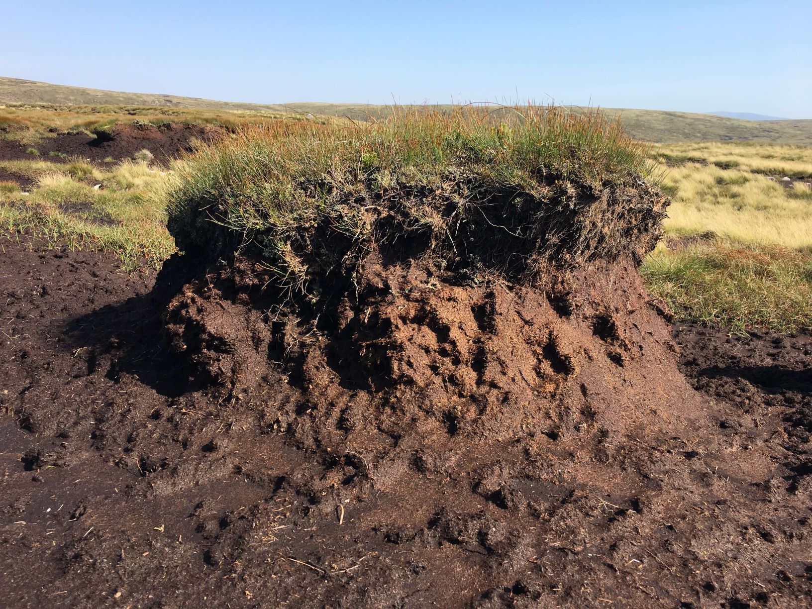 Erosion: this remaining tuft of peat shows the previous ground level. The peat around it has been eroded away completely.