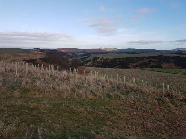 This is a native broadleaf project, south east of Dunbar. The project is the creation of new Oak (75%) woodland which will connect two areas of existing mature native (SSSI) Oak woodlands. In addition there are 15% Silver Birch and 10% woody shrubs. All are planted with feathered upper edges, to ensure sympathetic appearance in valley landscape and improve habitat for Black Grouse. The project will protect 1 mile of watercourse, improving water quality. Existing Gorse cover was cut to allow access, but otherwise retained to preserve worthwhile native habitat and cover. The long term aim of this woodland is to produce utilisable timber on a Continuous Cover basis, with a 100 year rotation, meaning no clear-felling, with instead selective thinning and re-planting ultimately producing an all-age broadleaf woodland. (In mainland Europe this is called 'Close to Nature Forestry, and it has significant biodiversity and carbon benefits in addition to supplying sustainable timber to the UK).